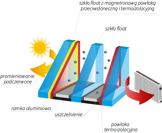 - Powłoka ta powstaje w wyniku napylania metodą magnetronową na powierzchnię szkła float bardzo cienkiego układu warstw metali i tlenków metali, który ma zdolność odbijania promieniowania długofalowego (np. ciepło wypromieniowane z grzejników czy ciepło oddawane przez ludzi, zwierzęta oraz przedmioty), natomiast prawie bez przeszkód przepuszcza promieniowanie krótkofalowe (słoneczne). Dodatkowo promieniowanie słoneczne przenikając przez przeszklenie powoduje nagrzewanie się ścian, podłóg, mebli itd., i zostaje zamienione na promieniowanie długofalowe, które jest odbijane do wewnątrz (tzw. efekt cieplarniany). Zastosowanie w oknie szyby zespolonej termoizolacyjnej zapewnia także wysoki komfort w pomieszczeniu, przede wszystkim poprzez redukcję tzw. ciągów zimnego powietrza oraz ograniczenie zjawiska kondensacji na szybach. Wypełnienie przestrzeni międzyszybowej gazem szlachetnym tj. argon lub krypton powoduje dodatkowe obniżenie strat ciepła z pomieszczenia.
